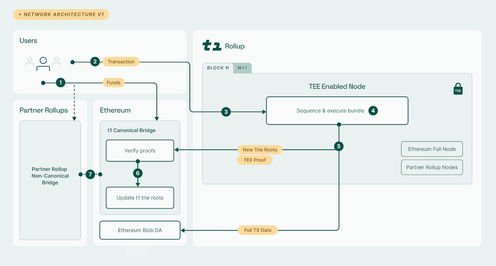 The TEE-enabled sequencer generates new trie roots r and a TEE proof. These are submitted to the t1 Canonical Bridge contract on Ethereum and the full compressed transaction data is submitted to Ethereum blob DA.